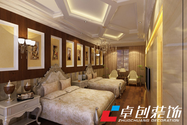 2、貼壁紙:歐式酒店室內(nèi)墻壁面層處理平整后,開鋪貼壁紙。在歐式酒店裝修中由于壁紙的種類非常多,有幾百種甚至上千種,色彩、花紋非常豐富。壁紙臟了,清潔起來也很簡單,新型壁紙都可以用濕布直接擦拭。