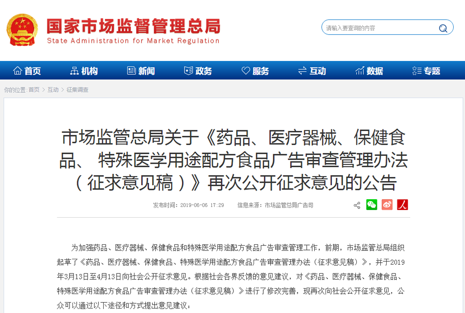 6月6日,國家市場監(jiān)管總局發(fā)布《藥品、醫(yī)療器械、保健食品、特殊醫(yī)學(xué)用途配方食品廣告審查管理辦法(征求意見稿)》(以下簡稱征求意見稿),這是今年3月13日以來,國家市場監(jiān)管總局就該管理辦法第二次公開征求意見。