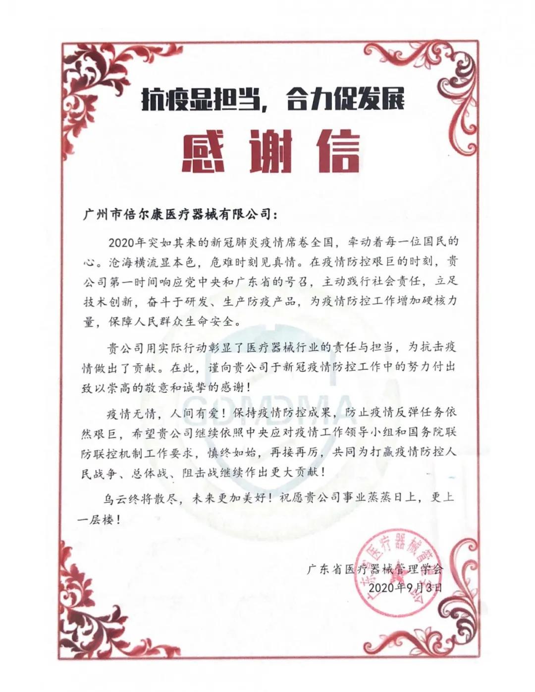 在現(xiàn)場(chǎng),倍爾康收到了廣東省醫(yī)療器械管理學(xué)會(huì)的感謝信——對(duì)倍爾康在疫情期間加班加點(diǎn)保質(zhì)量促生產(chǎn),發(fā)揚(yáng)廣東省醫(yī)療器械大愛(ài)無(wú)疆的奉獻(xiàn)精神,助力一線防控表示感謝!