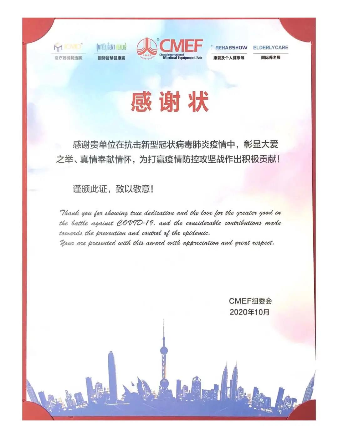 近日,倍爾康收到了中國國際醫(yī)療器械博覽會(CEMF)頒發(fā)的感謝狀,感謝倍爾康在新冠疫情告急之時,積極組織員工加班加點(diǎn)生產(chǎn)體溫計,用實(shí)際行動助力一線抗疫。