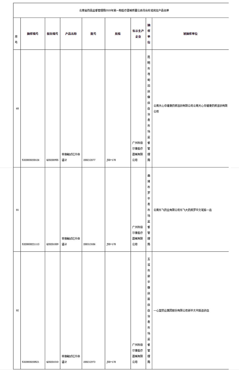 日前,云南省藥品監(jiān)督管理局發(fā)布2020年第一期醫(yī)療器械質(zhì)量公告,倍爾康的非接觸式紅外體溫計JXB-178被抽樣檢查,并順利通過質(zhì)量監(jiān)督!