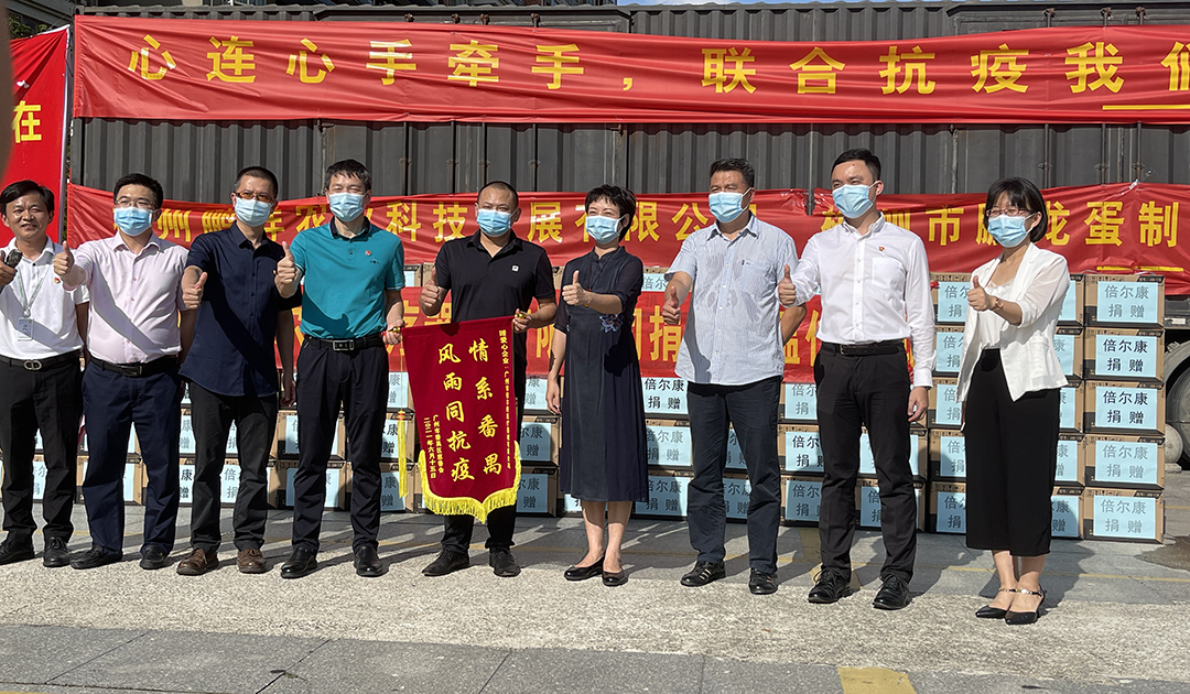 番禺區(qū)各領(lǐng)導(dǎo)與倍爾康總經(jīng)理郭智超捐贈儀式上合照