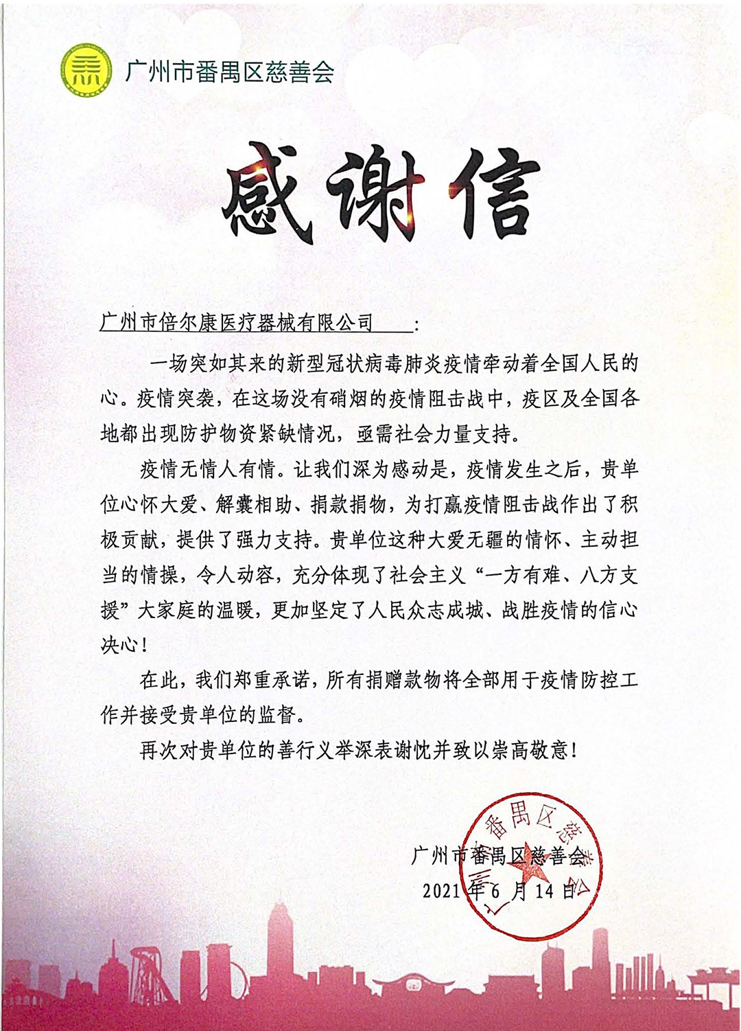 番禺區(qū)慈善會致謝倍爾康