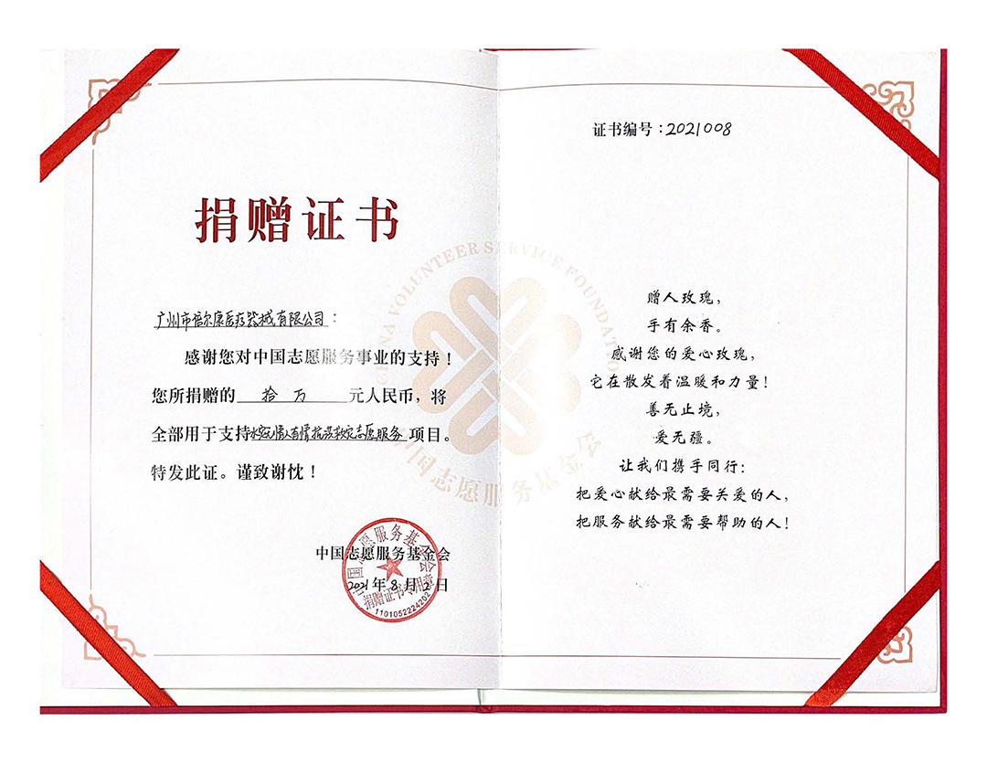 中國志愿服務(wù)基金會頒發(fā)的捐贈證書